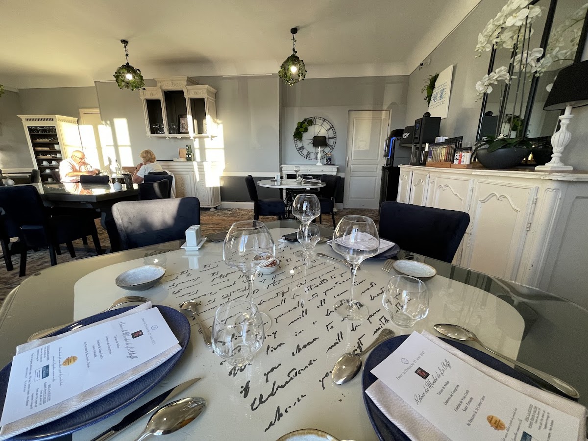 Un cadre assez charmant dans ce petit hôtel qui accueille une « cuisine du marché » en 3 temps définis par la cheffe. Le soir venu, un joli rayon de soleil illumine la salle plongée dans une ambiance paisible et silencieuse. Côté cuisine, on s’attendait à des mets un peu plus élaborés. Le repas reste bon, avec une cuisine très simple et familiale qui pourrait s’assumer davantage. tartare de melon en guise s’amuse bouche (petits dés de melon dans une petite verrine), nous nous attendions à un effet tartare un peu travaillé et assaisonné. La crème de courgette est joliment présentée mais reste extrêmement crémeuse. Plat principal en sauce et île flottante. Comptez environ trente sept euros pour ce menu entrée-plat-dessert. Peut être un peu cher pour un menu unique. Le service est vraiment charmant et contribue au bon moment passé à table. L’hôtel a l’air très mignon mais nous ne l’avons pas testé.